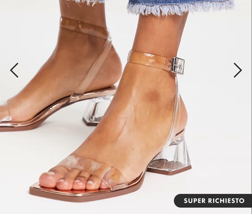 Proseguiamo poi con Pull&Bear che ci propone questo sandalo con tacco effetto nude, ma anche mecanic: tacco molto spesso con giuntura a vista, soletta minimal color cipria chiarissimo e doppia fibbia su dorso e dita del piede, offre un fascino davvero unico ed è perfetto da indossare su abiti midi o mini, gonne longuette o minigonne in denim, ma anche tailleur chiari color carta da zucchero, rosa o pesca. Anche qui troviamo la punta quadrata per ammorbidire leggermente la squadratura e l’effetto vitreo del vinile.