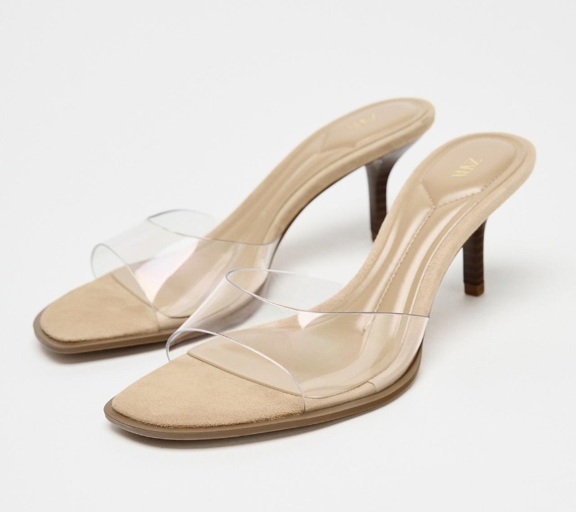 O ancora le zeppe aperte in corda, che come avevamo visto qualche tempo fa sono tornate alla ribalta, specialmente con le punte aperte. Ecco quindi che i sandali trasparenti giocano il loro ruolo fondamentale nei futuri look estivi, anche se comunque potremo sfruttarli già ora. E di brand che si sono impegnati nel proporci modelli davvero stupendi non ne troviamo di certo poco! Come non partire ovviamente da Zara che ci regala questo flat effetto mule in vinile con tacco medio, punta a trapezio asimmetrica e soletta morbida, per rendere grazia a un look sia sportivo che un po’ più casual ed elegante.