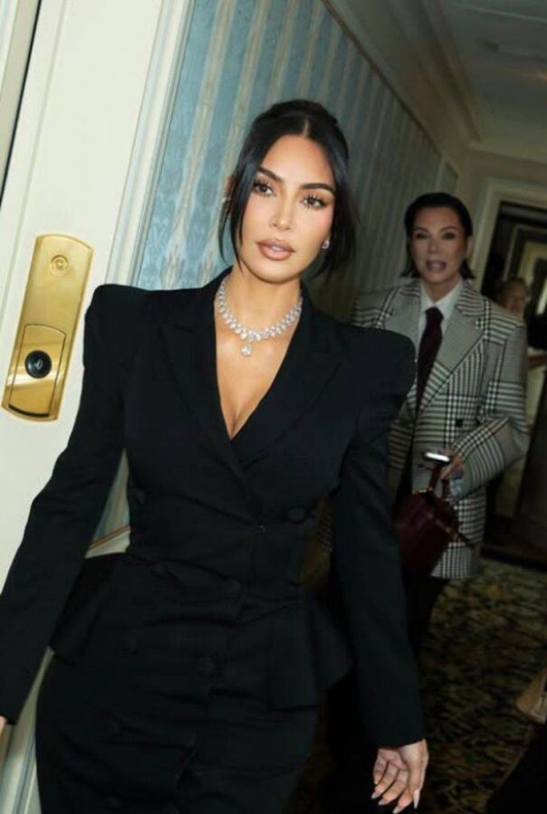 Kim non si limita a essere presente. Costruisce la propria presenza come solo lei sa fare: con rigore, teatralità contenuta e un uso chirurgico della moda. Il look è nero, deciso, composto, ma è il dettaglio prezioso a ribaltare il senso. C’è quella consapevolezza fredda di chi ha imparato a controllare ogni fotogramma della propria vita pubblica. E c’è Kris. Sì, la madre Kris Jenner, presente come sempre, ma con un dettaglio nuovo: a 69 anni sembra la sorella più grande. Capelli slicked-back, completo scuro con blazer a quadri, occhiali scuri, pelle liscia, andatura decisa. E da tempo ormai, lo sappiamo, Kris non è solo madre. È la momager.