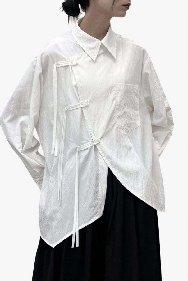 La camicia japandi è una delle chiavi dello stile. Ampia, con abbottonature non convenzionali, spesso asimmetrica o con dettagli a contrasto, non si limita a essere uno strato neutro. Ha una funzione strutturale. Modella il look, crea movimento. Un esempio perfetto è la Shirt Hikari di Sumoka Studio, realizzata in nylon fluido e leggero.