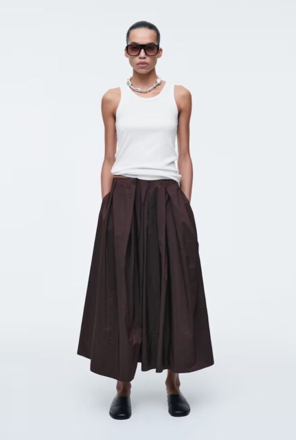 Infine, i pantaloni larghi. Nello stile japandi non sono solo comodi, sono un elemento di espressione. Voluminosi ma controllati, leggeri ma strutturati. I pantaloni culotte con pieghe di COS sono perfetti per questo. Vita elasticizzata sul retro, gamba larga e morbida, finitura satinata che riflette la luce con discrezione. Il tessuto è in poliestere riciclato, una scelta coerente con l’idea di sostenibilità silenziosa che attraversa tutto l’approccio japandi. Visivamente ricordano i tradizionali Hanaka pants, ma con un tocco contemporaneo.