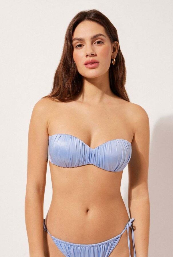 Parliamo di tessuti con effetto seta, ma senza la pretesa di sembrare troppo preziosi. Lucidi quanto basta per riflettere il sole, morbidi da indossare, resistenti a sabbia, acqua salata e giornate infinite sotto l’ombrellone. I modelli sono tre, ma ognuno ha il suo carattere. C’è la fascia senza ferretto che valorizza anche un seno abbondante, il triangolo con coppe graduate per chi ama il volume, e l’intero super comodo ma con scollo profondo. I colori fanno la differenza: lilla, rame, azzurro intenso. E ogni tonalità funziona meglio su certi incarnati e colori di capelli. Basta scegliere bene.