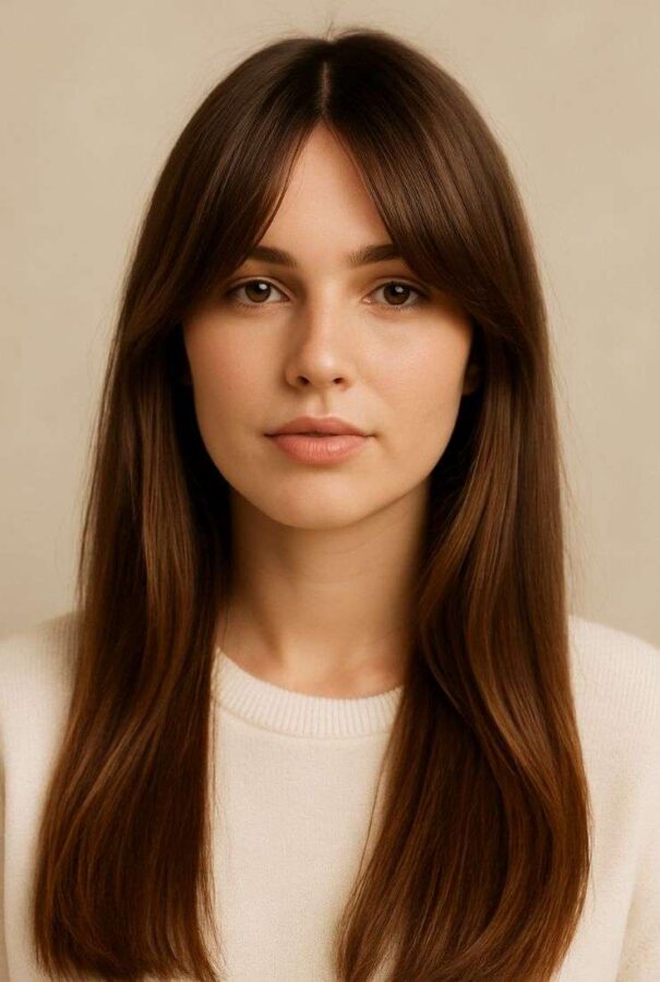 La frangia a tendina ha bisogno di una piega fatta bene già da bagnata: con una spazzola e qualche passaggio preciso si ottiene l’effetto morbido senza usare la piastra.