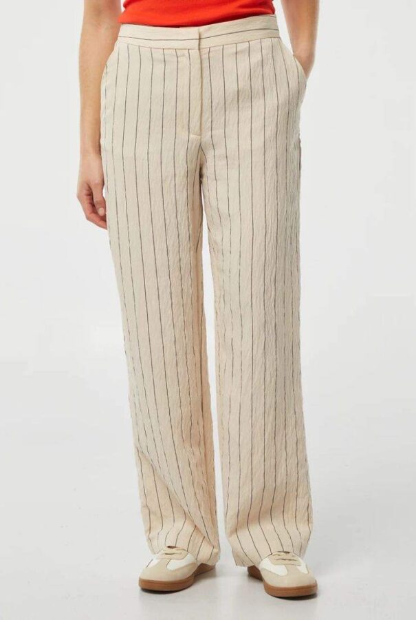 Il modello Kiabi è forse il più sottovalutato. Costa poco, ma ha una vestibilità interessante: gamba regolare con pinces davanti, vita media, chiusura con zip e bottone. Le righe sono discrete, tono su tono, e il tessuto è abbastanza leggero da reggere anche il caldo cittadino. Con una t-shirt infilata dentro e un sandalo con zeppa diventa un perfetto look da giorno, mentre con una blusa in satin può trasformarsi per una cena informale. Il punto forte? Il taglio pulito, che valorizza anche chi ha forme più morbide.