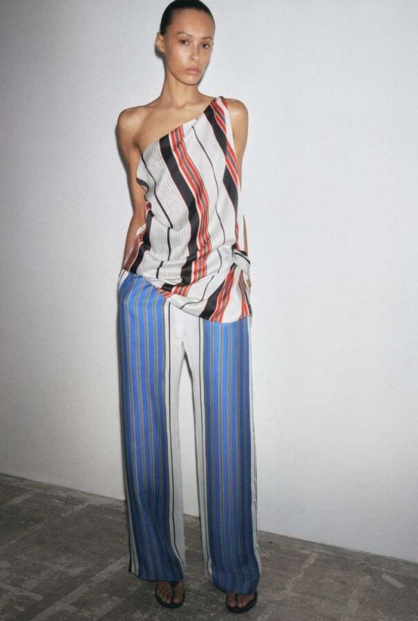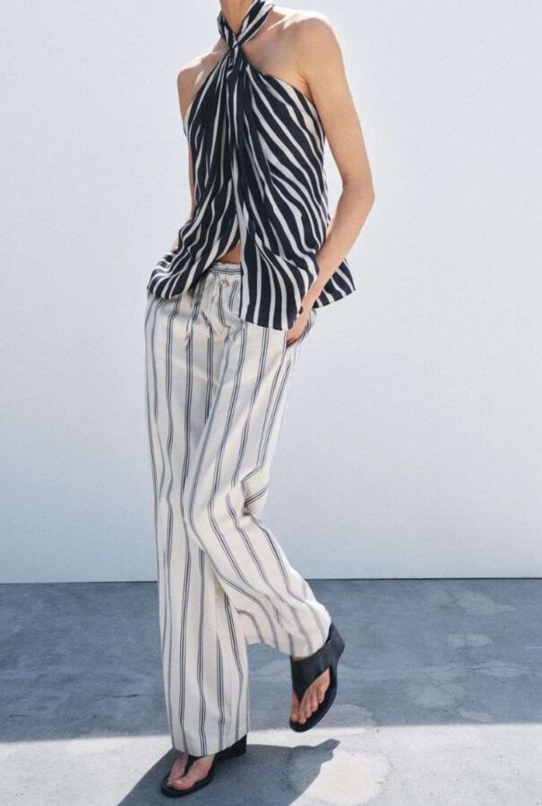 Questa estate ci sono almeno cinque modelli che vale la pena guardare da vicino. I pantaloni palazzo écru della linea ZW Collection di Zara sono realizzati in filato di cotone leggero, con vita media regolabile tramite coulisse e gamba dritta. Le righe sottili e a contrasto li rendono facili da portare sia con un top basic che con una camicia fluida, perfetti per chi cerca comfort senza rinunciare a una linea pulita.