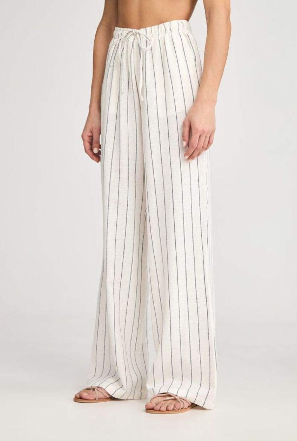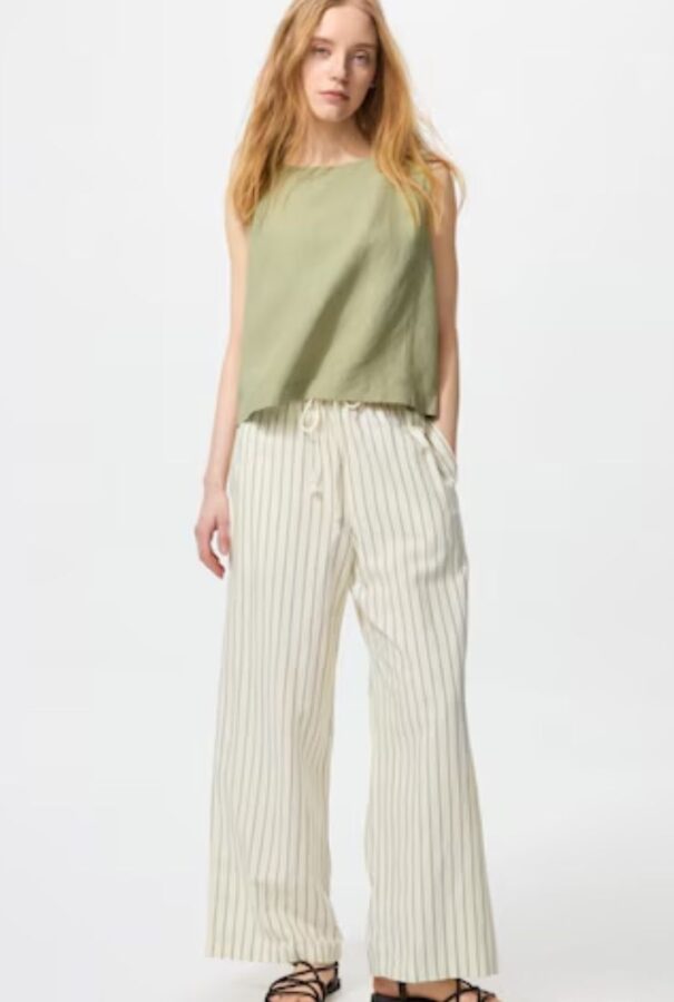Chiudiamo con il pantalone in misto lino di Uniqlo, forse il più essenziale ma proprio per questo molto versatile. Il tessuto è un mix di lino e viscosa, liscio e morbido al tatto, con taglio dritto e coulisse sottile che permette di regolare la vestibilità. Le righe sono fini, ben distribuite. Si abbina facilmente a colori neutri, ma regge bene anche accostamenti più forti, come il rosso ruggine o l’azzurro polvere. Ha un’anima molto cittadina, ma si adatta anche ai look da vacanza. Sta bene a chiunque ami sentirsi a proprio agio senza sembrare trascurata.