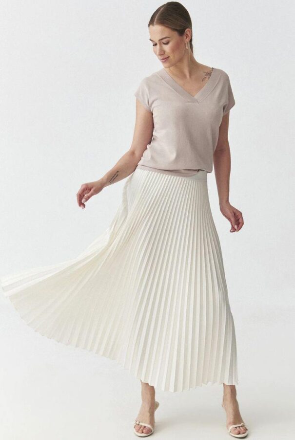 Se si preferisce una base più femminile, la gonna midi plissé è perfetta. Si muove, riflette la luce, spezza la monotonia del bianco con la sua tridimensionalità. I pantaloni culotte, invece, sono una soluzione per chi ama la praticità. Hanno la stessa eleganza di una gonna, ma sono più facili da portare. E se scelti in un tessuto morbido e opaco, danno subito un effetto raffinato senza sforzo.