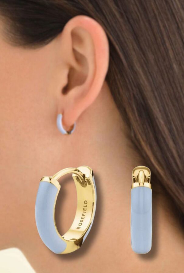 Poi ci sono gli orecchini Candy Pop Huggies di Rosefield, piccoli cerchi in metallo dorato smaltati in un azzurro latte delicatissimo. Questo tipo di blu, se portato vicino al viso, rinfresca subito tutto il look. Ha un effetto pulito, leggero, ma con personalità. È perfetto su un outfit minimal, come una jumpsuit sabbia o un completo lino e viscosa nei toni neutri. Il consiglio è portare i capelli raccolti, magari con qualche ciocca libera. L’azzurro lavora bene se lasciato libero, senza altri colori forti a competere. Un trucco naturale, una clutch beige, e sei a posto.