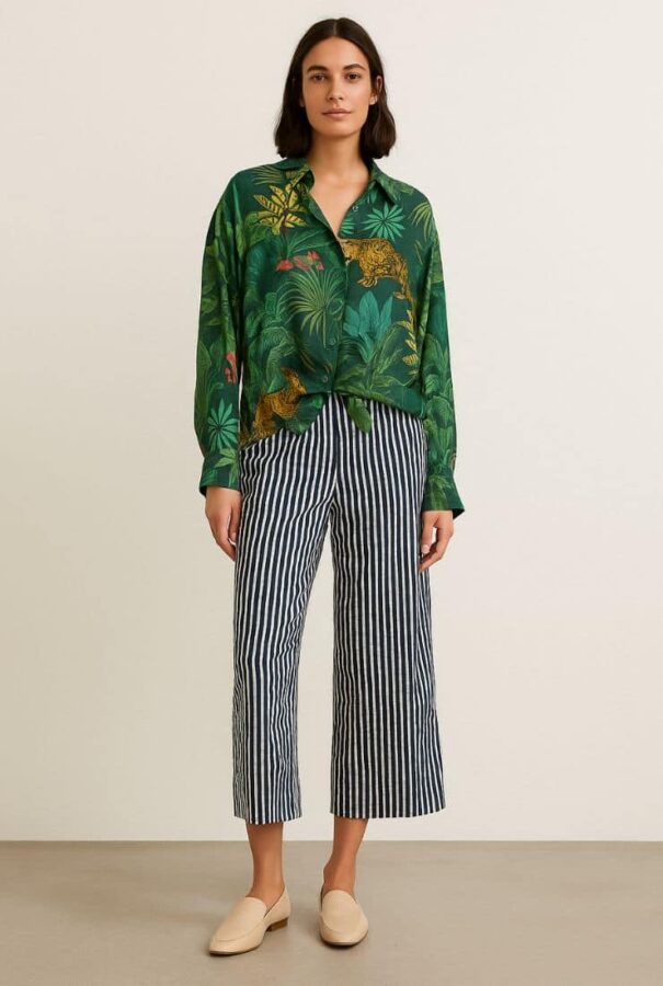 La seconda combinazione gioca su una camicia jungle dal taglio over, ideale se leggera e fluida. Il trucco qui è lasciarla morbida, magari con qualche bottone aperto e le maniche arrotolate. Sotto, dei pantaloni cropped a righe sottili, magari in bianco e blu, aiutano a bilanciare il volume della camicia con qualcosa di più pulito ma comunque dinamico. Le righe danno verticalità e allungano la figura. Completa con un paio di slingback color cuoio o mocassini estivi, e una borsa compatta, anche vintage.