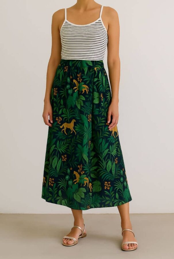 Il terzo abbinamento è quello più versatile e, forse, il più facile da personalizzare. Un top a righe sottili – a manica corta, canotta o addirittura off-shoulder – può adattarsi a tantissime situazioni. L’importante è che le righe siano leggere, così da non litigare con la gonna a stampa jungle, che qui è la vera protagonista. Meglio una gonna midi, ampia, con movimento e una stampa colorata ma non troppo densa. Perfetto sia con sandali dorati piatti per un’uscita di giorno, sia con zeppe naturali se vuoi qualcosa di più deciso. Un paio di occhiali vintage e una borsa in rafia fanno il resto.