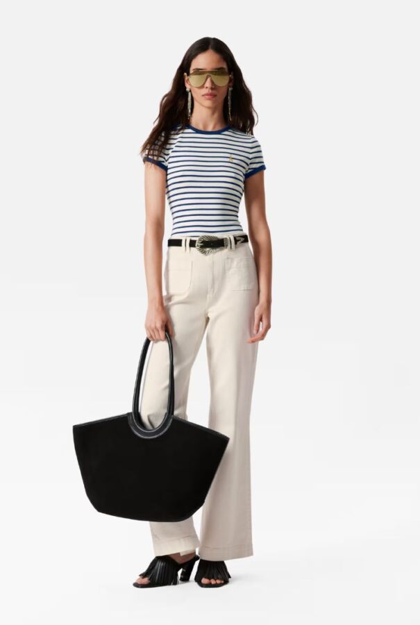 Anche gli accessori fanno la loro parte. Una T-shirt a righe chiede leggerezza: borse in tela, shopper in paglia, zoccoli morbidi, occhiali da sole oversize. Se invece la si porta verso il lato più cittadino, allora via libera a borse strutturate, sneakers pulite, un rossetto rosso come punto colore.