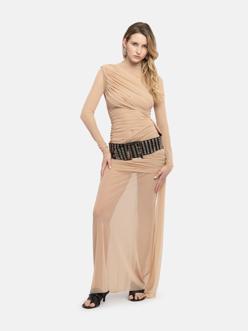 Molto interessanti sono i due abiti da sera eleganti dalla linea drapped, un po’ come avevamo visto sul corpo di Elodie a Sarà Sanremo presentandosi al fianco di Carlo Conti con un abitino di seta composto da due soli singoli strati, che lasciavano intravedere la nudità sensuale della cantante. Anche qui troviamo la lavorazione a veli, con una struttura super drappeggiata su spalla, seno e fianchi, mentre il resto è di una trasparenza molto leggera.