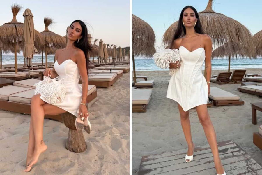L’abito in questione è il modello Milana firmato MonBlanche, marchio emergente che gioca con i codici classici, ma con tessuti decisi e linee teatrali. Costa circa 110 euro, ma ne dimostra molti di più. La struttura è rigida ma modellante, pensata per seguire la figura, con una silhouette da clessidra che sembra studiata al millimetro. E quella spallina laterale fatta di nastri intrecciati è il dettaglio che cambia tutto, spostando l’asse da romantico a grafico. Un capo così non passa inosservato, nemmeno in mezzo ai tramonti di Ibiza.