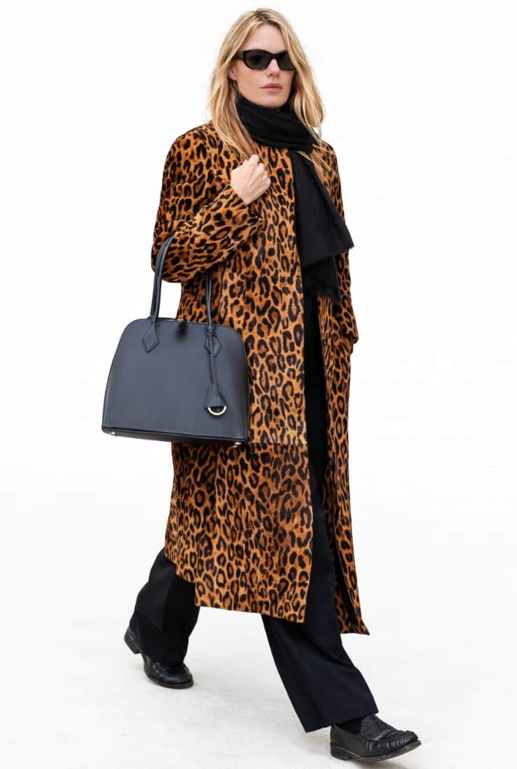 Il total black resta uno degli abbinamenti più efficaci. Non per togliere forza alla stampa, ma per darle spazio. Il maculato sopra il nero diventa grafico, leggibile, quasi ordinato. Funziona di giorno, funziona la sera, funziona quando si ha poco tempo per pensare al look. Basta curare le proporzioni, tenere il cappotto leggermente over, lasciare che cada dritto. Il risultato è immediato e non stanca.